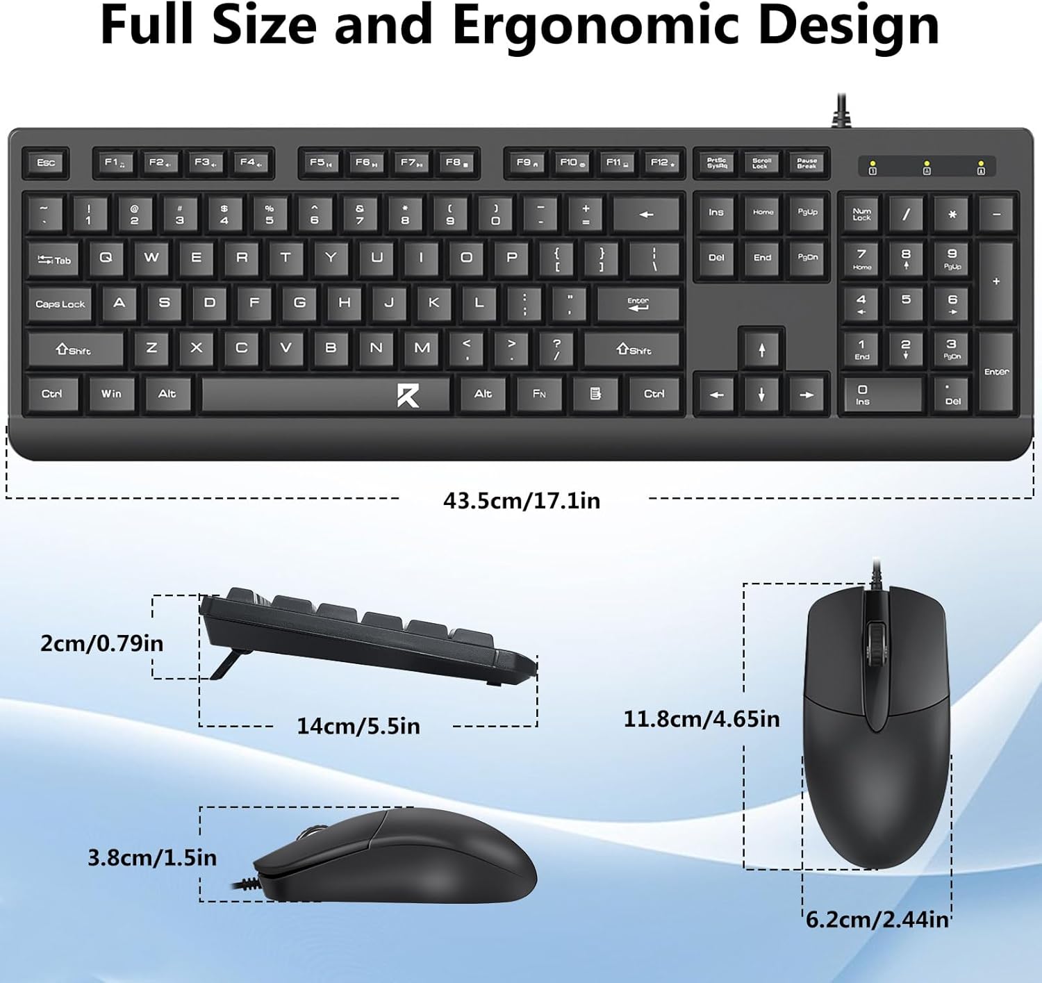 Il layout della tastiera di dimensioni standard include un tastierino numerico, tasti multimediali e una comoda spaziatura tra i tasti. Il mouse in dotazione è progettato per un tracciamento accurato e un movimento fluido del cursore su varie superfici.