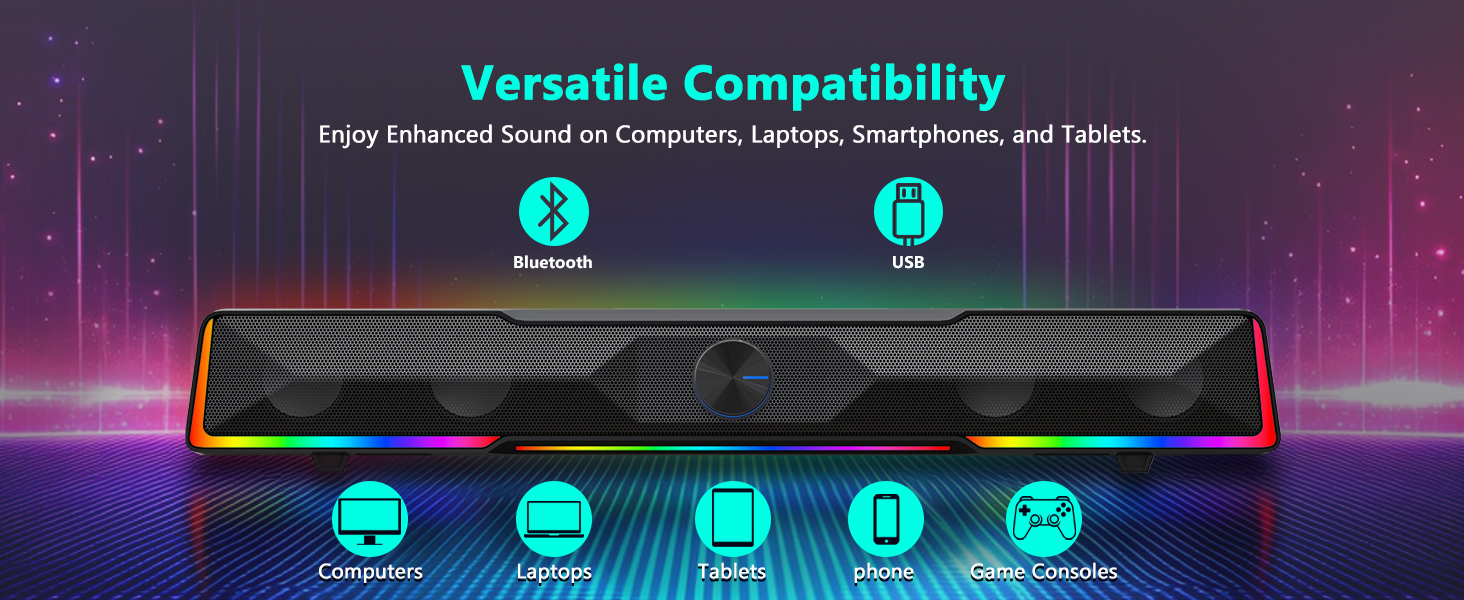 Dispositivi compatibili L'altoparlante per computer con manopola del volume della soundbar con connessione cablata Bluetooth/USB GS516 nero è progettato per funzionare con un'ampia varietà di dispositivi. I dispositivi compatibili in genere includono: