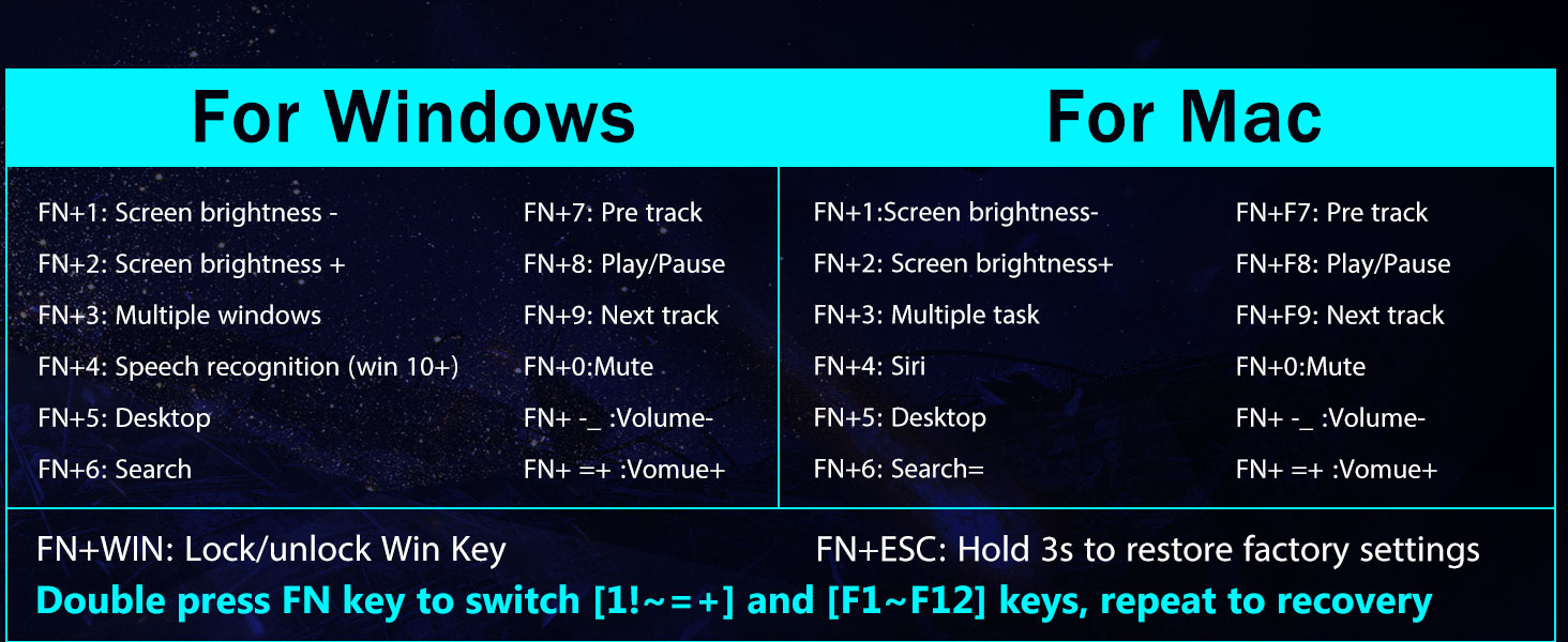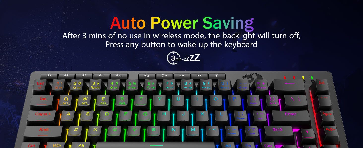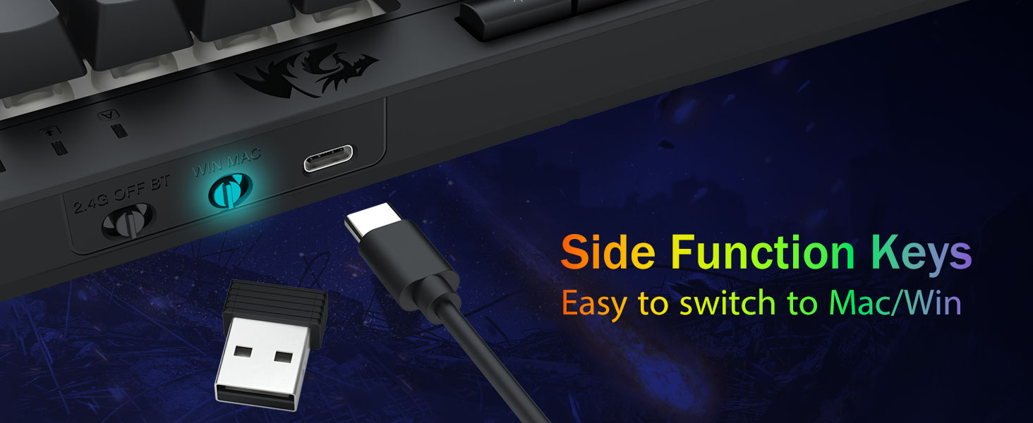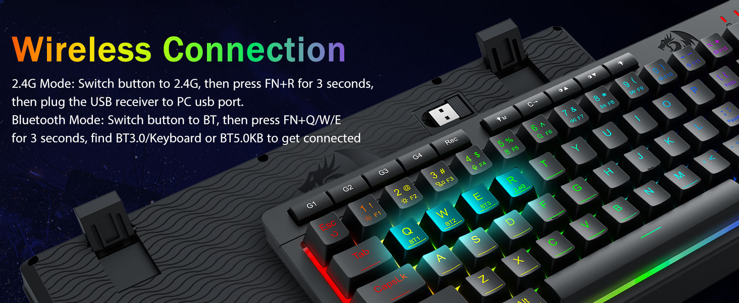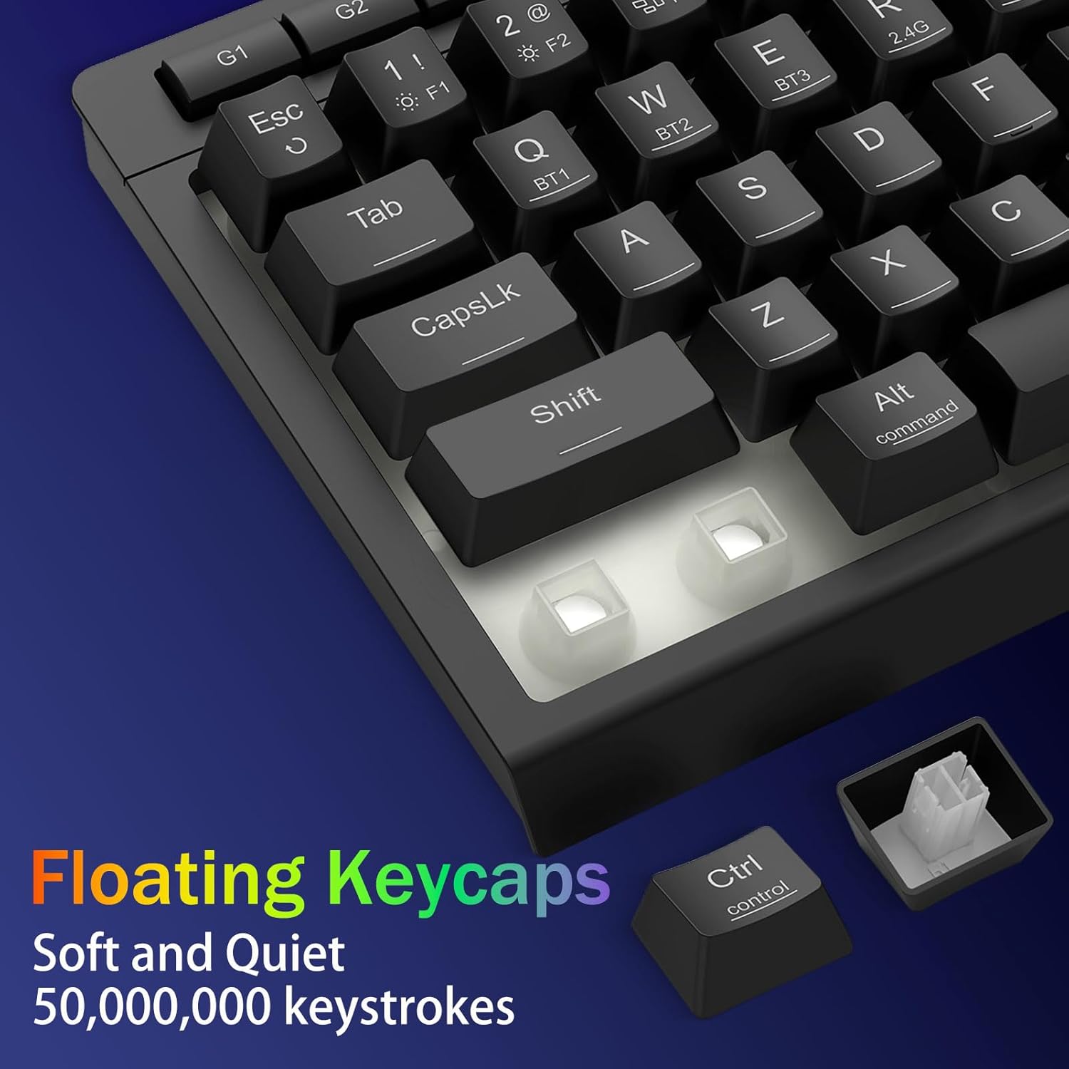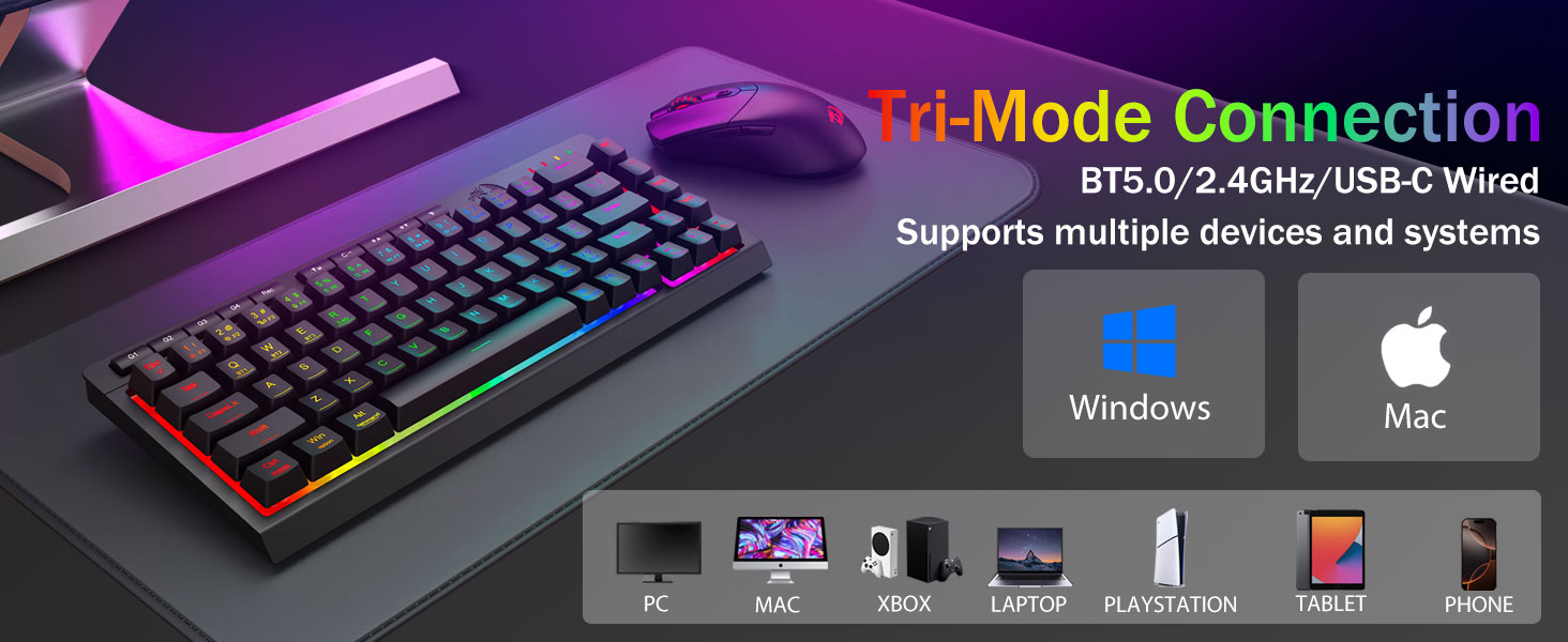 Versatilità a tre modalità e padronanza multi-dispositivo -Passa senza problemi tra le modalità Bluetooth 5.0, wireless a 2,4 GHz o cablata USB-C, collegando fino a 5 dispositivi contemporaneamente (PC, Mac, tablet, telefoni, PS/XBOX). Attiva facilmente i dispositivi tramite i tasti di scelta rapida o il pulsante laterale: perfetto per configurazioni ibride di lavoro/gioco. Rimani alimentato per settimane con la batteria da 4.000 mAh (oltre 30 giorni in standby, 50 ore di autonomia RGB).