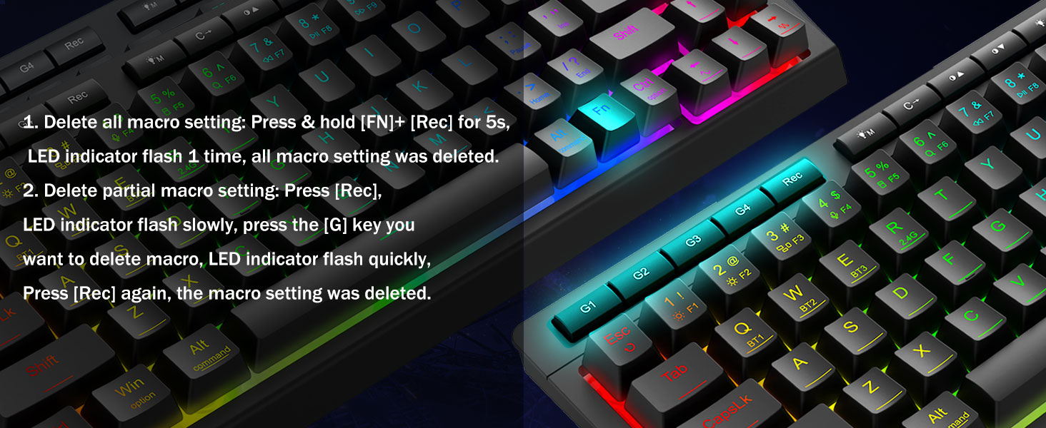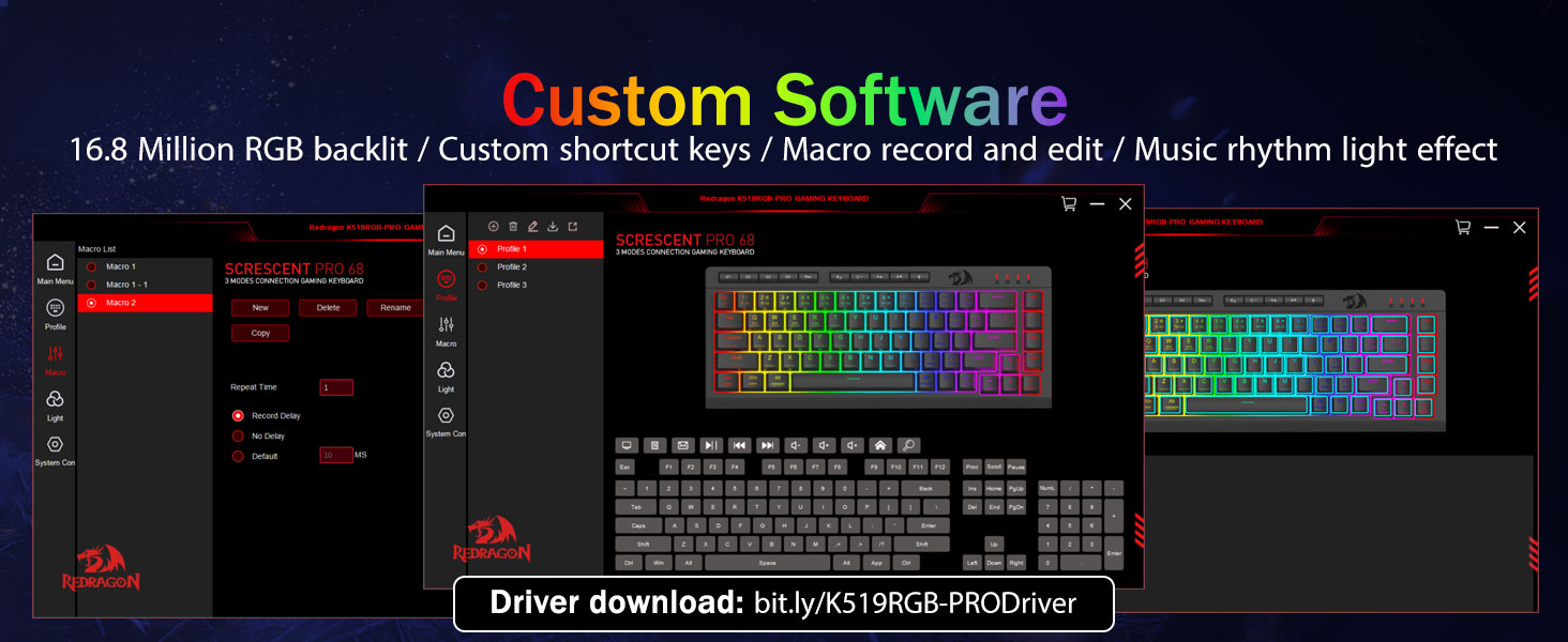 Macro personalizzabili, controllo semplice -Programma istantaneamente i 4 tasti macro integrati (G1-G4), senza bisogno di software. Registra combo complesse per i giochi, scorciatoie per la produttività o comandi multimediali. Ridefinisci il tuo flusso di lavoro in pochi secondi. Puoi anche utilizzare il software per personalizzare funzioni, creare macro, regolare le luci RGB e impostare scorciatoie. Collegamento software: bit.ly/K524RGB-PRODriver