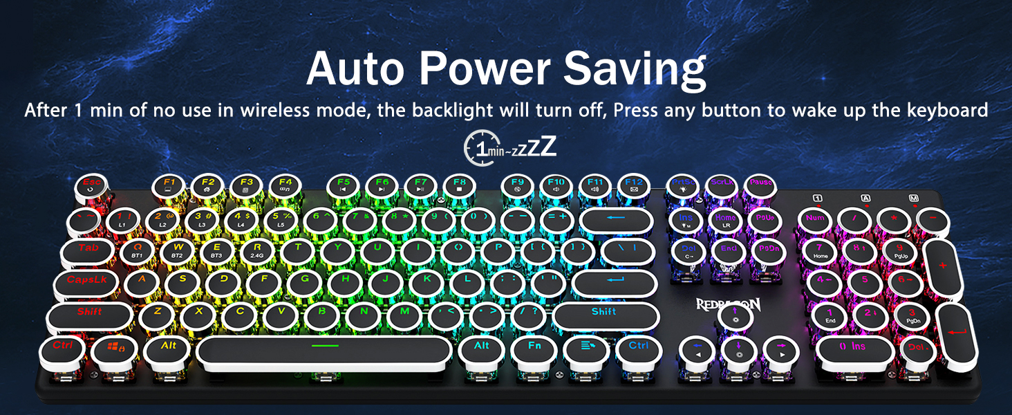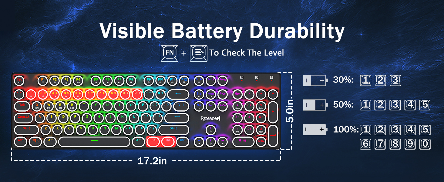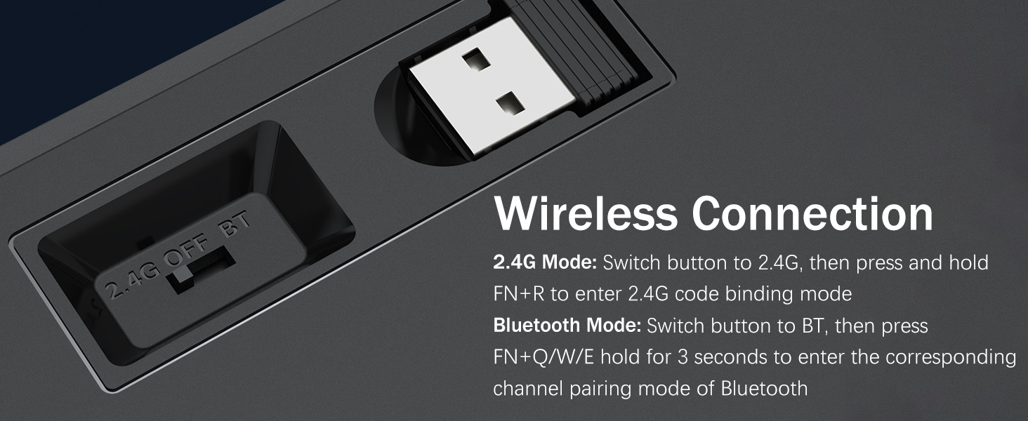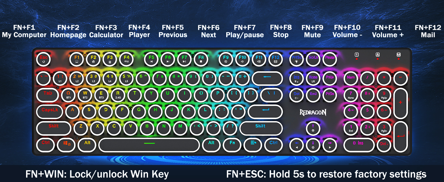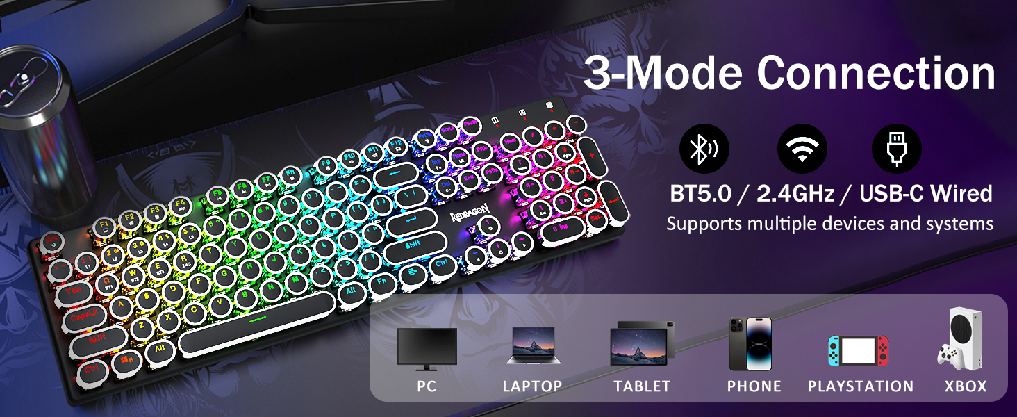 𝟯-𝗠𝗼𝗱𝗲 𝗖𝗼𝗻𝗻𝗲𝗰𝘁𝗶𝗼𝗻 -Dotato dell'innovativa tecnologia di connessione tri-mode Redragon, modalità wireless USB-C cablata, Bluetooth 5.0/3.0 e 2,4 Ghz che rendono l'esperienza dell'utente aggiornata a un altro livello in tutti i campi. Premere FN+Q/W/E per la modalità Bluetooth, premere FN+R per la modalità 2.4G.
