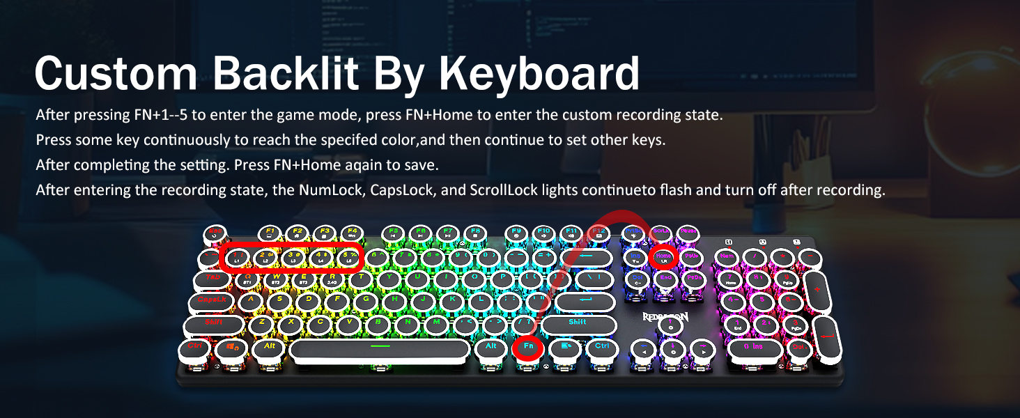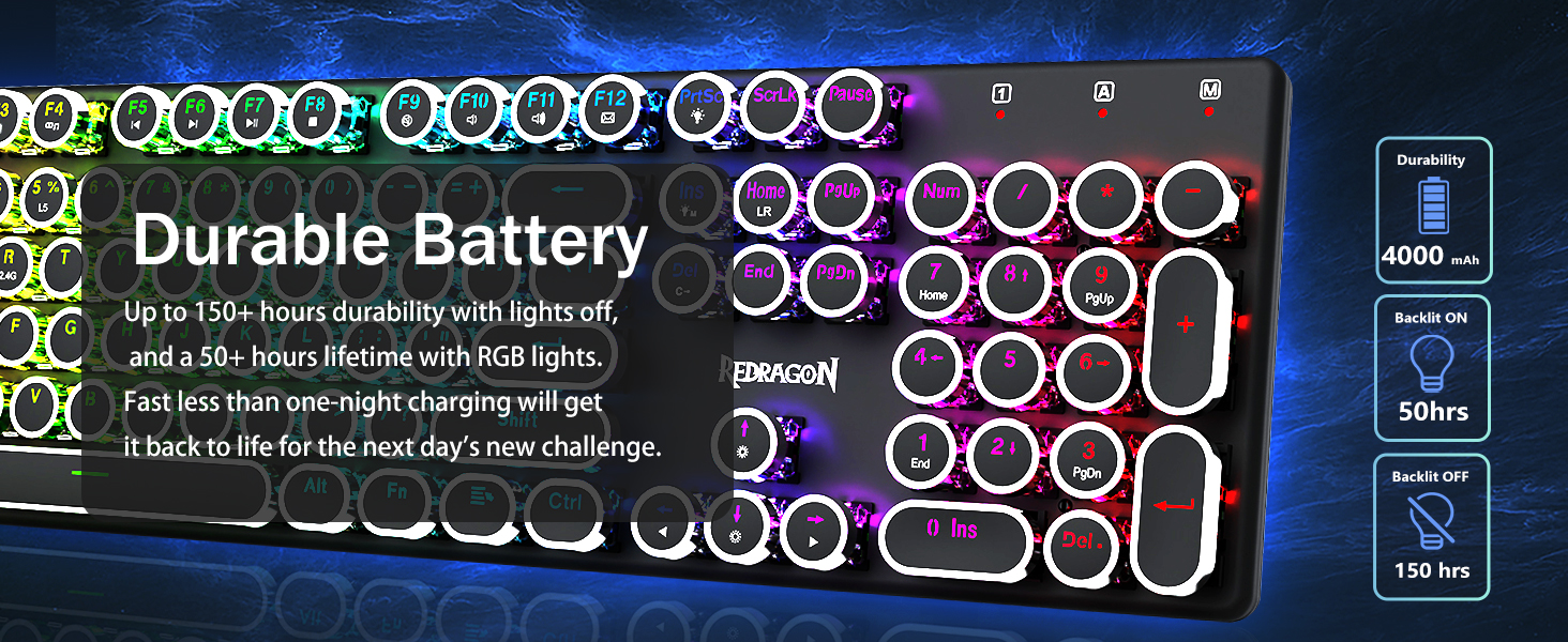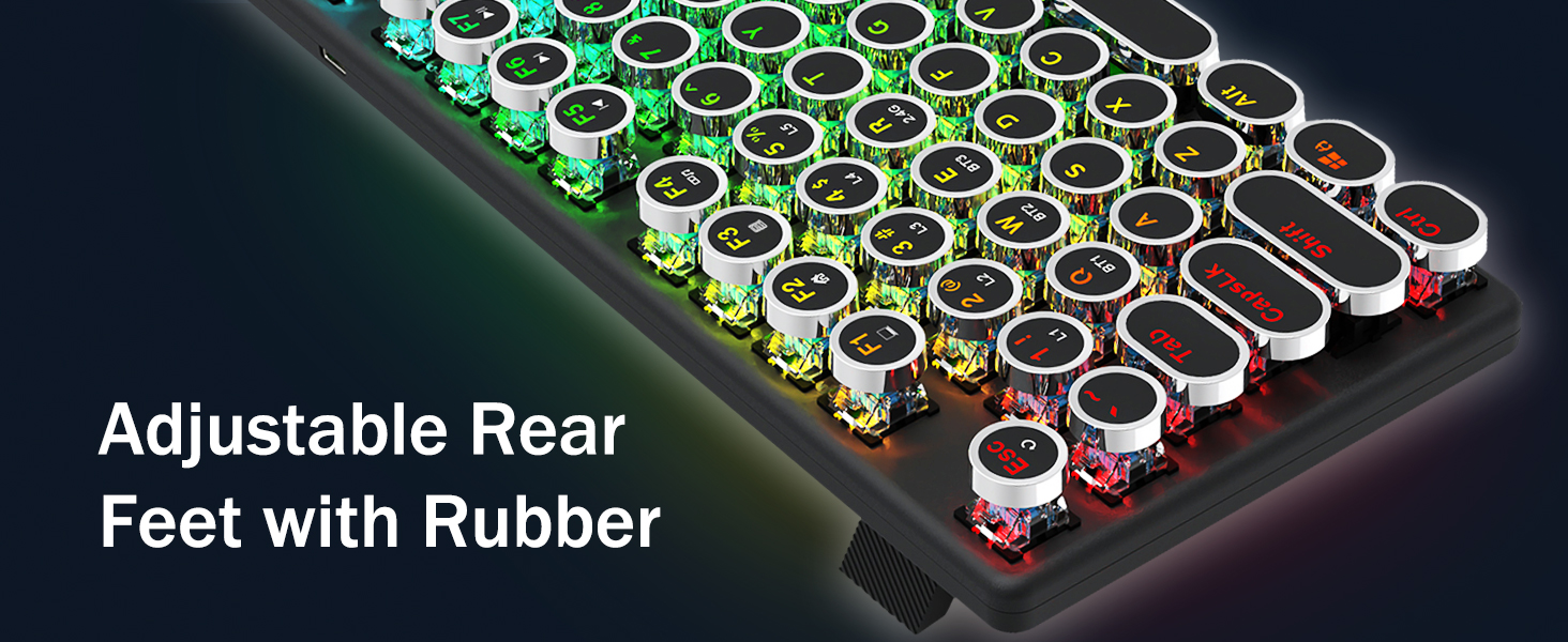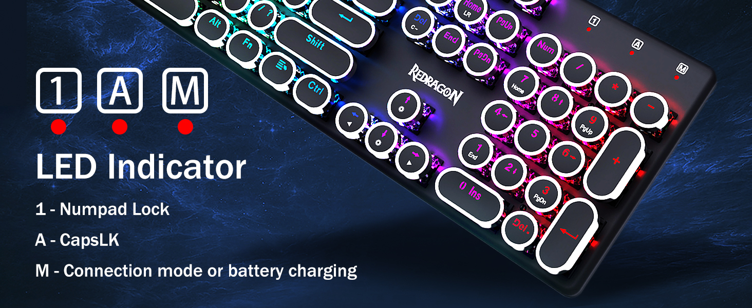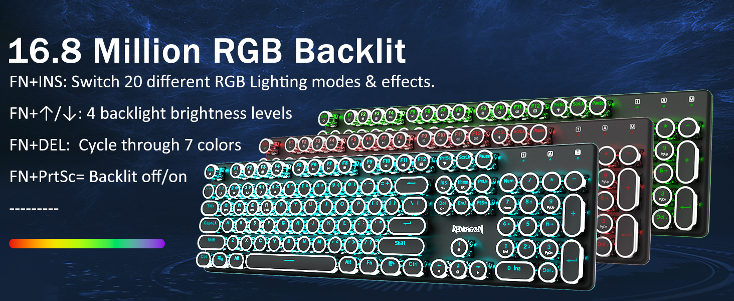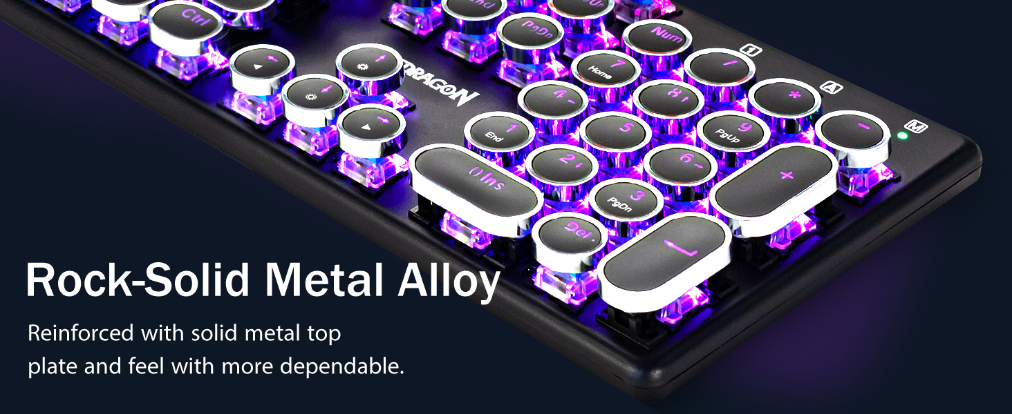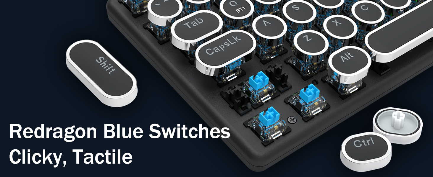 𝗥𝗲𝘁𝗿𝗼 𝗧𝘆𝗽𝗲𝘄𝗿𝗶𝘁𝗲𝗿 𝗦𝘁𝘆𝗹𝗲 𝘄𝗶𝘁𝗵 𝗠𝗲𝗰𝗵𝗮𝗻𝗶𝗰𝗮𝗹 𝗞𝗲𝘆𝘀 -Gli interruttori blu Redragon Mechanical offrono una resistenza media, un clic udibile e un feedback tattile, forniscono un ambiente e prestazioni di gioco reattivi e precisi. I copritasti rotondi della tastiera steampunk vintage assomigliano a una macchina da scrivere classica, ti offrono una sensazione di digitazione confortevole e un tocco stabile.