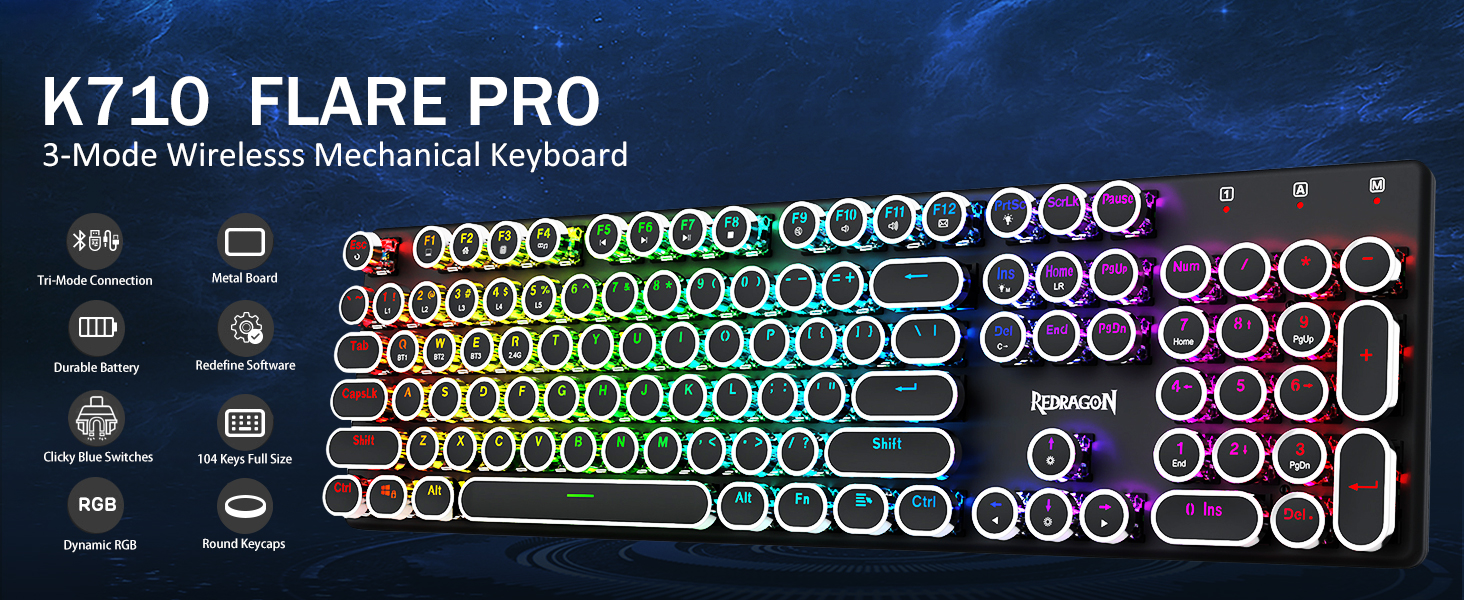 𝗗𝗲𝗽𝗲𝗻𝗱𝗮𝗯𝗹𝗲 𝗠𝗲𝘁𝗮𝗹 𝗣𝗮𝗻𝗲𝗹 & 𝟭𝟬𝟰 𝗞𝗲𝘆𝘀 𝗔𝗻𝘁𝗶 𝗚𝗵𝗼𝘀𝘁𝗶𝗻𝗴 -La versione FLARE PRO aggiornata continua a utilizzare lo stesso materiale metallico solido del serbatoio. Mantieni la tastiera stabile ed elegante sulla scrivania, per un'esperienza di digitazione eccezionale. La tastiera K710 supporta la tecnologia anti-ghosting a 104 tasti, consente di premere più tasti contemporaneamente senza conflitti.