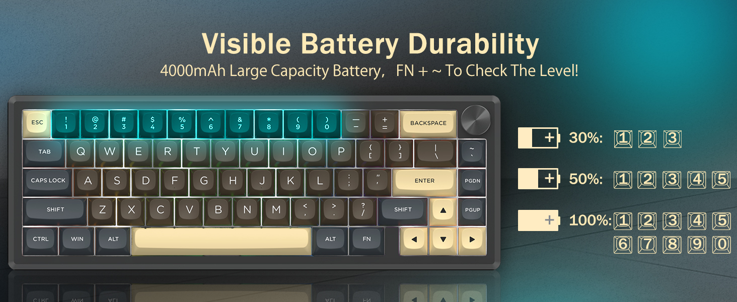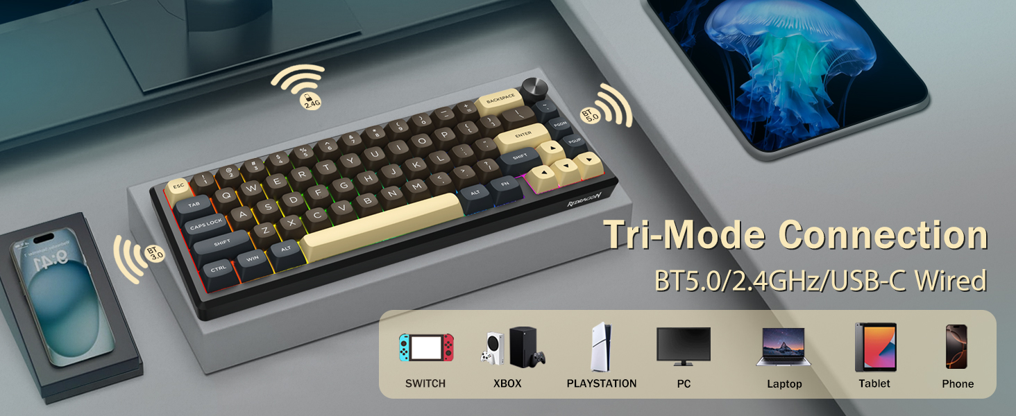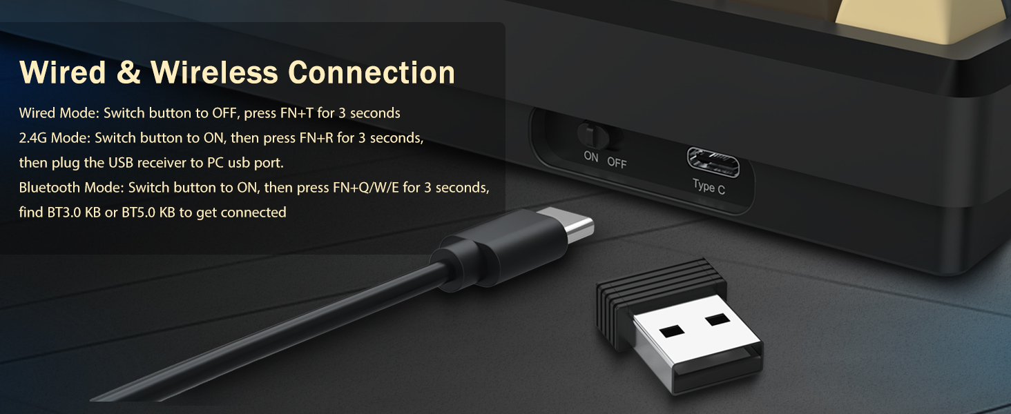 La tastiera supporta la connettività wireless per comodità e una connessione USB cablata per prestazioni stabili. Gli utenti possono passare da una modalità all'altra in base alla loro configurazione.