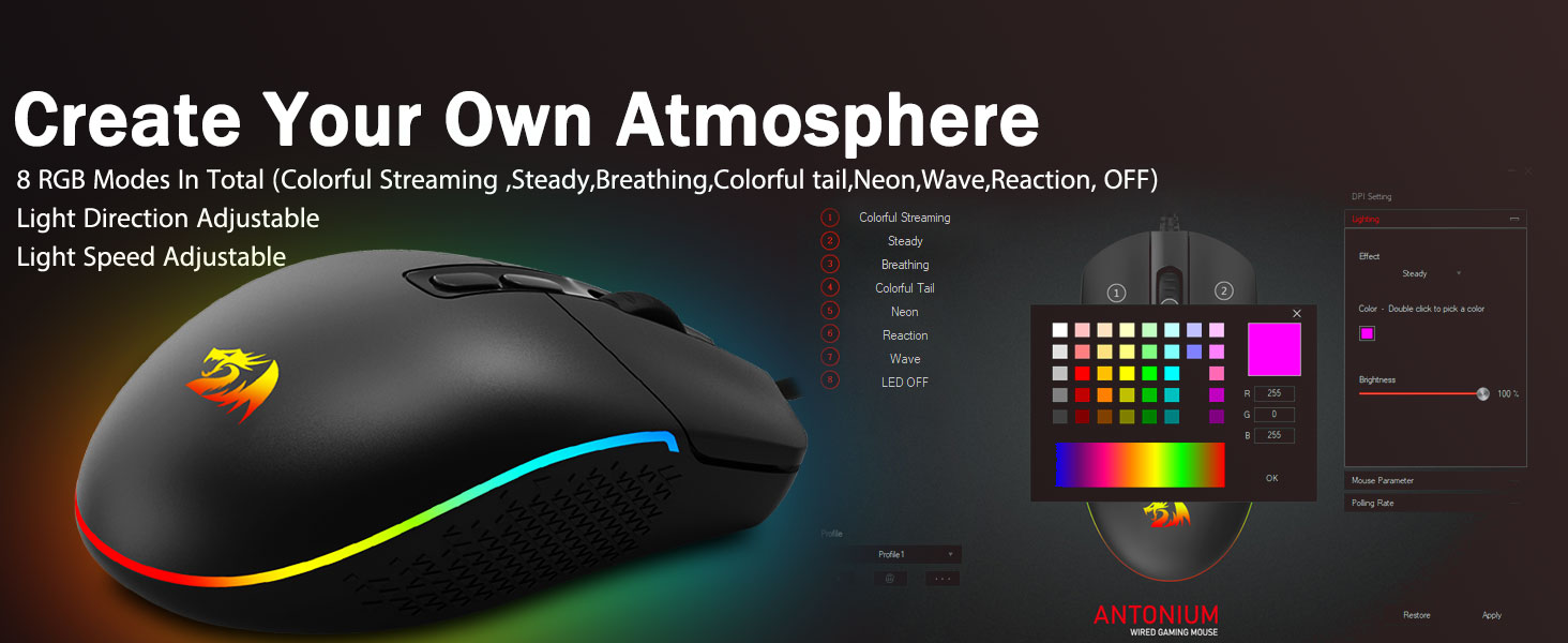 8 modalità di retroilluminazione RGB decenti- Accendi la retroilluminazione e fai qualche uccisione nel tuo campo di battaglia di gioco. L'atmosfera dinamica della retroilluminazione RGB non ti deluderà mai quando decorerai il tuo spazio di gioco, sarebbe meglio con altri accessori Redragon con le luci accese.