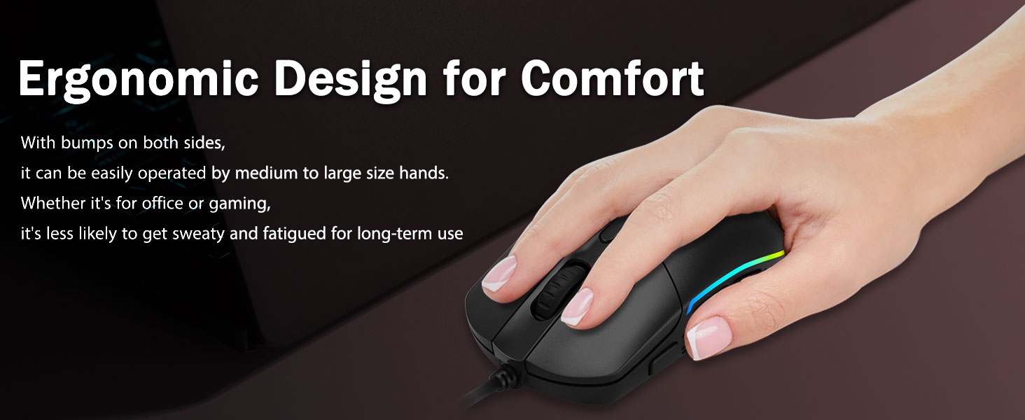 Presa comoda- I rilievi ergonomici su entrambi i lati rendono i mouse da gioco adatti a qualsiasi mano. Fornisce un comfort duraturo ai giocatori, senza affaticamento anche durante lunghe ore di gioco intenso. Non scivolerà quando si solleva il mouse da gioco o si effettuano movimenti rapidi e precisi.