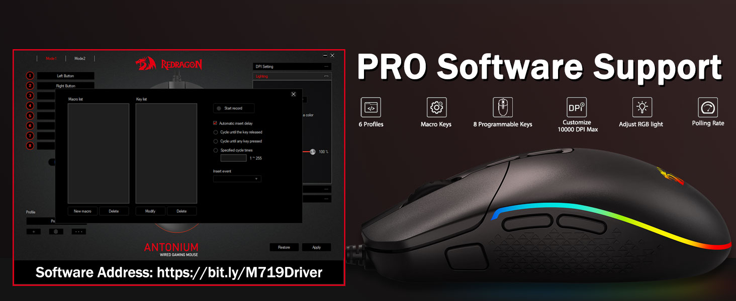 5 livelli DPI regolabili e 4 tassi di polling- Il mouse M719 è progettato con 5 livelli DPI disponibili: DPI 400/800/1600/2400/4000. facile passare tra le diverse esigenze di gioco. I DPI possono essere regolati liberamente di ±100 da 100 a 10000 tramite software per soddisfare tutte le vostre esigenze. 4 velocità di polling regolabile: 125Hz/250Hz/500Hz/1000Hz, l'elevata frequenza di polling garantisce un movimento fluido e veloce.