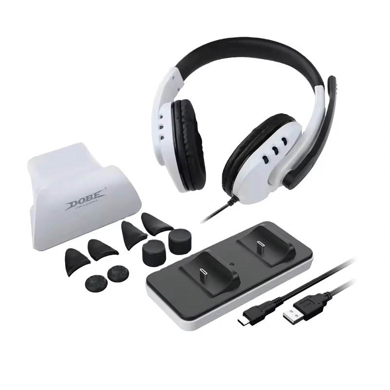 Controller di gioco DOBE PS5 personalizzato all'ingrosso 12 in 1 set, caricatore per sedile + cuffie cablate + supporto + pulsante di attivazione + set di tappi per joystick