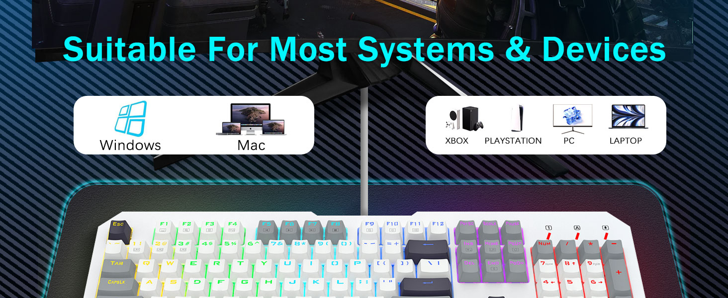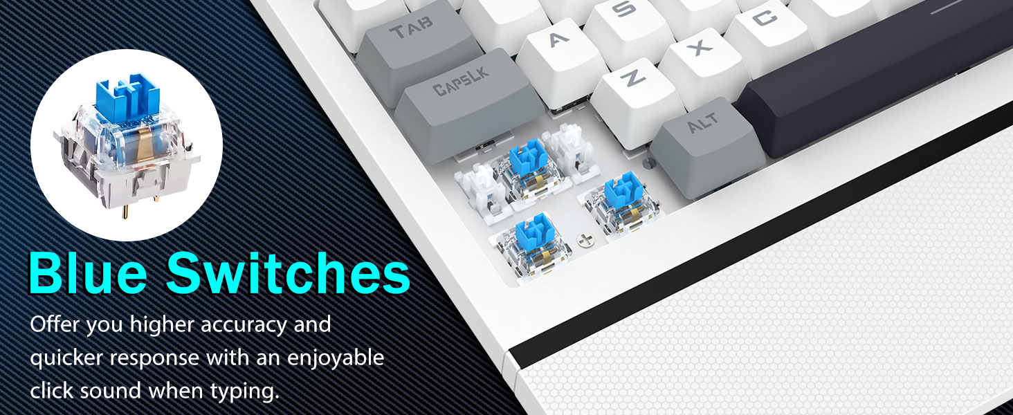 【Interruttori blu reattivi per una digitazione di precisione】La nostra tastiera per PC è dotata di interruttori blu cliccabili che forniscono tempi di risposta rapidissimi e notevole precisione. Ogni pressione di un tasto produce un suono di clic soddisfacente, migliorando la tua esperienza di digitazione. Con una corsa dei tasti più profonda, un feedback più forte e una spaziatura più ampia, la digitazione non solo è più precisa ma anche molto più comoda. Se sei un fan della sensazione tattile e "scattante", la nostra tastiera è la scelta perfetta per te.