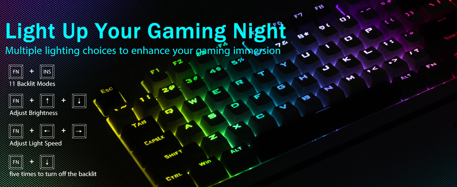 【Tastiera retroilluminata arcobaleno per un'esperienza coinvolgente】Illumina il tuo desktop con 11 modalità di retroilluminazione dinamica, 5 livelli regolabili di velocità e luminosità. Questa tastiera rappresenta una svolta per la tua configurazione di gioco, migliorando il tuo umore e il tuo coinvolgimento, soprattutto in ambienti con scarsa illuminazione. I copritasti in ABS a doppia iniezione ultra resistenti garantiscono una retroilluminazione cristallina e uniforme, migliorando la precisione di digitazione anche al buio.