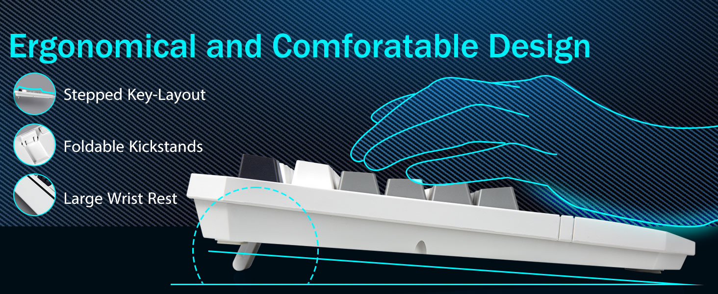 【Ergonomia avanzata per un comfort che dura tutto il giorno】Progettata pensando al tuo comfort, la nostra tastiera da gioco per PC presenta un layout scientifico dei tasti con scala verso l'alto e un ampio poggiapolsi. Questa configurazione mantiene le braccia in una posizione naturale, riducendo l'affaticamento della mano durante l'uso prolungato. La tastiera cablata è inoltre dotata di 2 cavalletti posteriori robusti e pieghevoli, che consentono di regolare l'inclinazione per una postura ottimale.