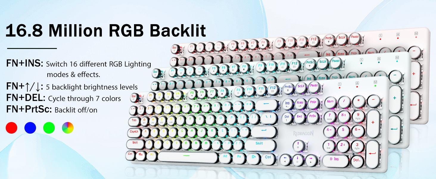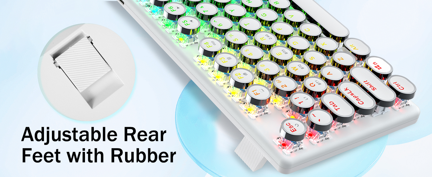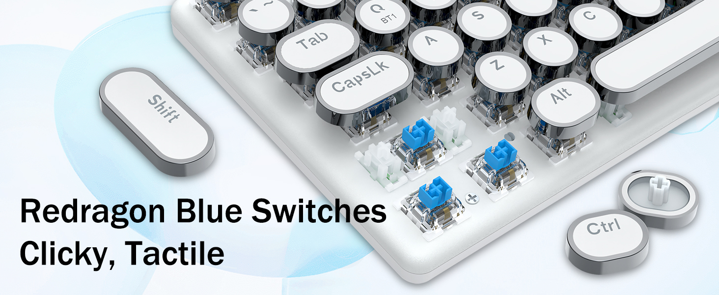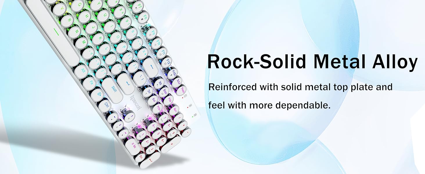 𝗥𝗲𝘁𝗿𝗼 𝗧𝘆𝗽𝗲𝘄𝗿𝗶𝘁𝗲𝗿 𝗦𝘁𝘆𝗹𝗲 𝘄𝗶𝘁𝗵 𝗠𝗲𝗰𝗵𝗮𝗻𝗶𝗰𝗮𝗹 𝗞𝗲𝘆𝘀- Gli interruttori blu Redragon Mechanical offrono resistenza media, suono di clic udibile e feedback tattile, forniscono ambiente e prestazioni di gioco reattivi e precisi. I copritasti rotondi della tastiera steampunk vintage assomigliano a una macchina da scrivere classica, ti offrono una sensazione di digitazione confortevole e un tocco stabile.