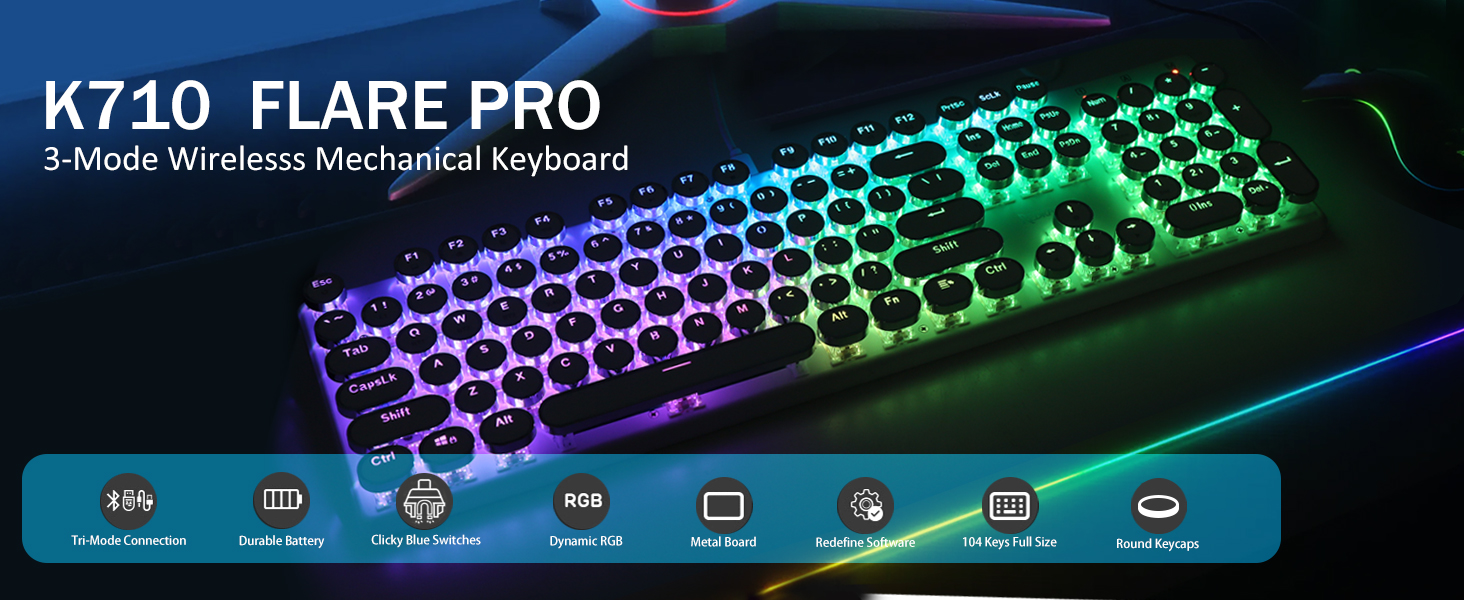 𝗗𝗲𝗽𝗲𝗻𝗱𝗮𝗯𝗹𝗲 𝗠𝗲𝘁𝗮𝗹 𝗣𝗮𝗻𝗲𝗹 & 𝟭𝟬𝟰 𝗞𝗲𝘆𝘀 𝗔𝗻𝘁𝗶 𝗚𝗵𝗼𝘀𝘁𝗶𝗻𝗴- La versione FLARE PRO aggiornata continua a utilizzare lo stesso materiale metallico solido del serbatoio. Mantieni la tastiera stabile ed elegante sulla scrivania, per un'esperienza di digitazione eccezionale. La tastiera K710 supporta la tecnologia anti-ghosting a 104 tasti, consente di premere più tasti contemporaneamente senza conflitti.