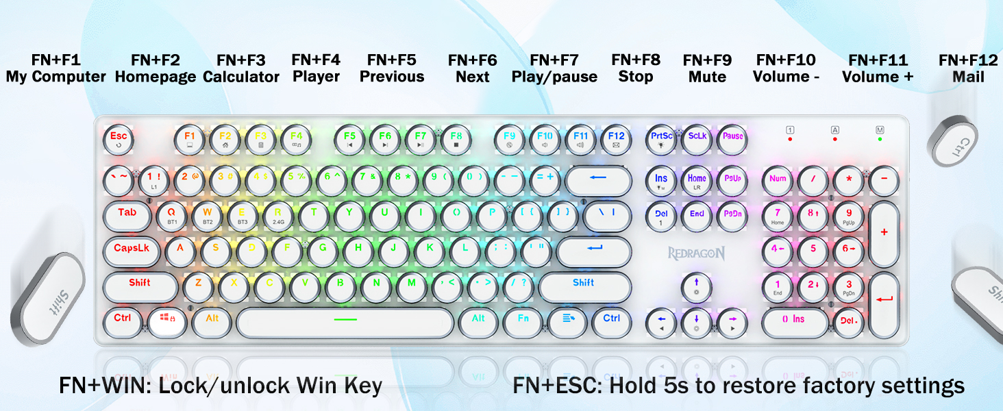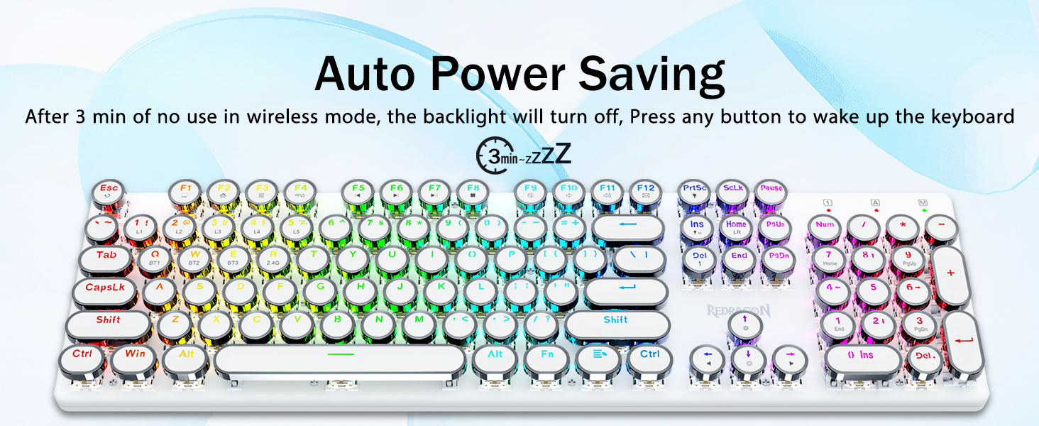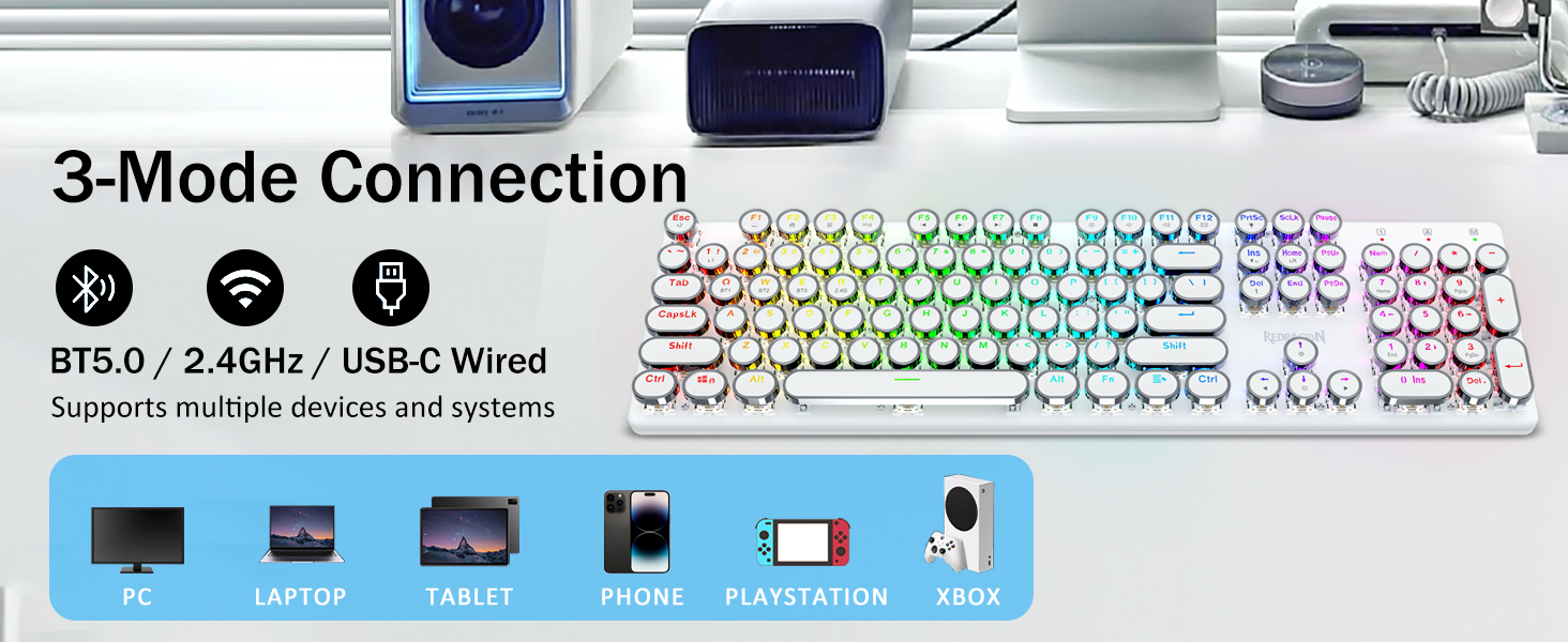 𝟯-𝗠𝗼𝗱𝗲 𝗖𝗼𝗻𝗻𝗲𝗰𝘁𝗶𝗼𝗻- Dotato dell'innovativa tecnologia di connessione tri-modalità Redragon, modalità wireless USB-C cablata, Bluetooth 3.0/5.0 e 2,4 Ghz che rendono l'esperienza dell'utente aggiornata a un altro livello in tutti i campi. Premere FN+Q/W/E per la modalità Bluetooth, premere FN+R per la modalità 2.4G.