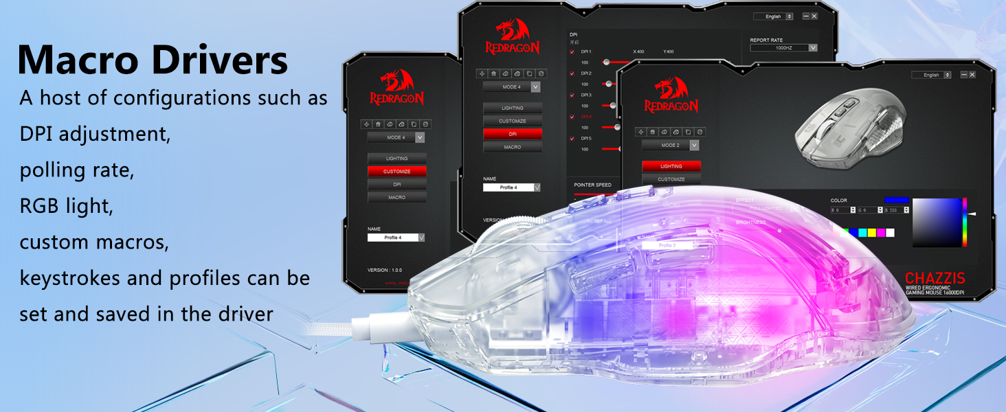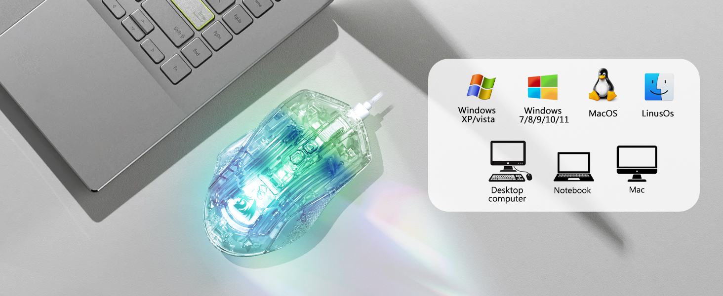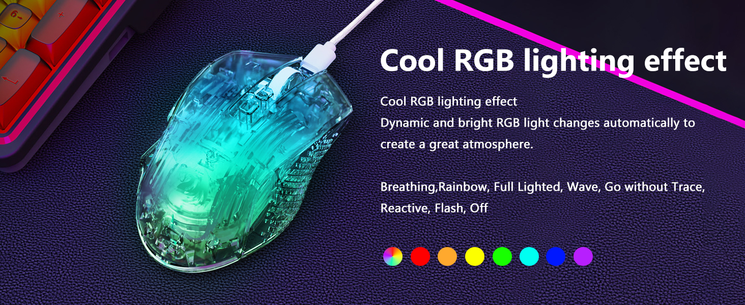 Il mouse include otto effetti di illuminazione RGB che migliorano l'impatto visivo senza influire sulle prestazioni. Gli utenti possono passare da una modalità di illuminazione all'altra in base alla propria configurazione o preferenza personale.